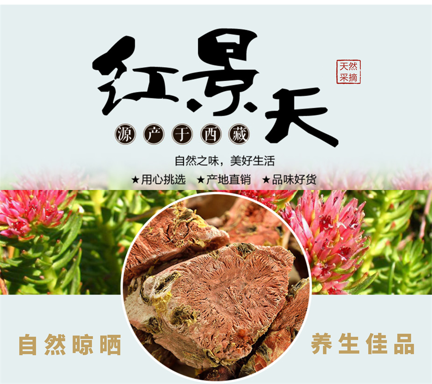 紅景天,中藥名。為景天科大花紅景天的干燥根和根莖,秋季花莖凋枯后采挖,除去粗皮,洗凈,曬干。紅景天的根莖呈圓柱形,粗短,略彎曲,少數(shù)有分枝,長(zhǎng)5~500px,直徑2.9~112.5px。表面棕色或褐色,粗糙有褶皺,剝開(kāi)外表皮有一層膜質(zhì)黃色表皮且粉紅色花紋,宿存部分老花莖,花莖基部被三角形或卵形膜質(zhì)鱗片,節(jié)間不規(guī)則,斷面粉紅色至紫紅色,有一環(huán)紋,質(zhì)輕,疏松。主根呈圓柱形,粗短,長(zhǎng)約500px,上部直徑約37.5px,側(cè)根長(zhǎng)10~750p..
